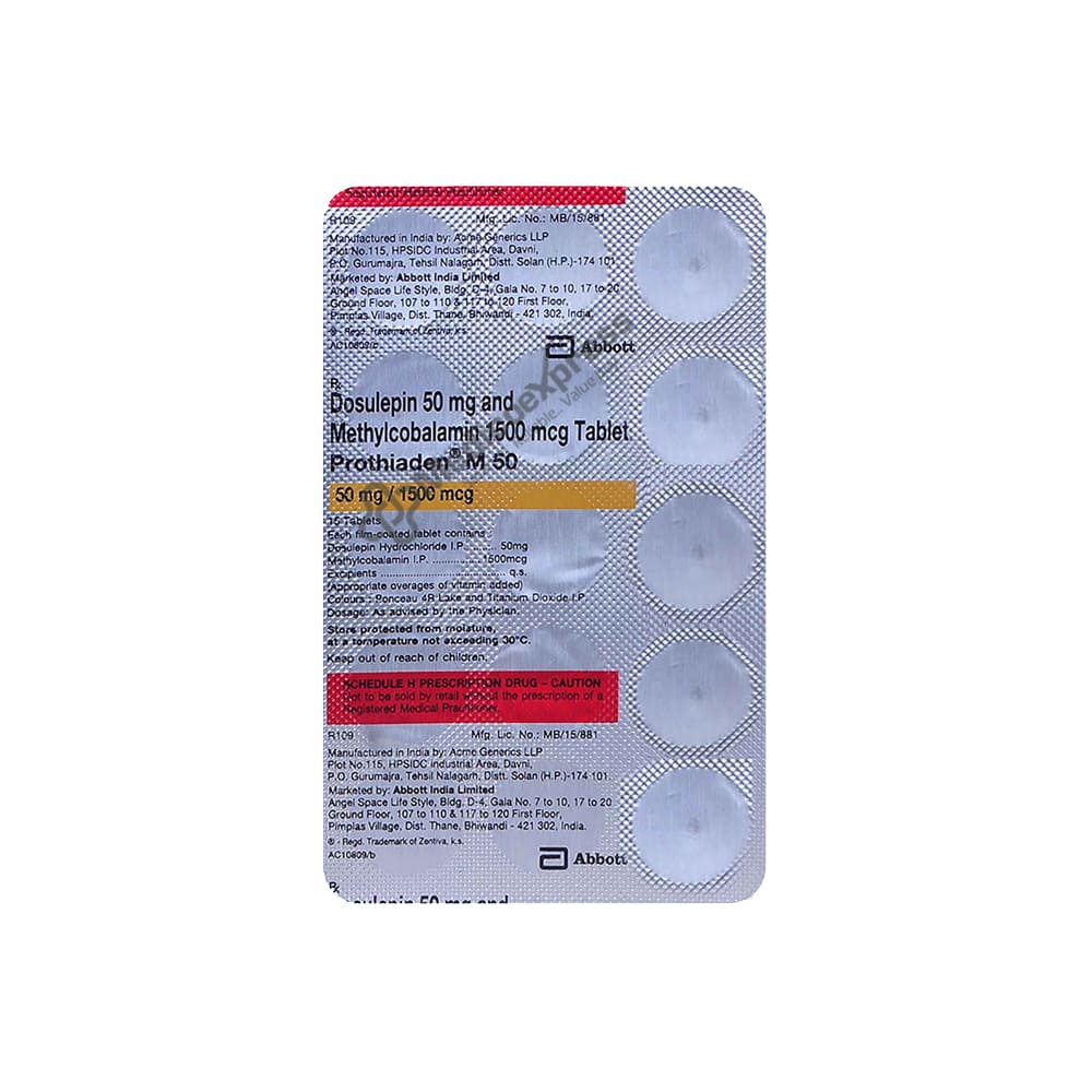 Prothiaden M 50 Tablet 15 belongs to the class of medications known as antidepressants, which are used to treat depression. Depression is a neurological condition. It is a mood disorder characterised by feelings of sadness, loss, or rage that persist. A lack of vitamin B12 can also cause this condition. When other antidepressant medications are ineffective, your doctor may prescribe it.Disclaimer:For More Information Contact Your Physician