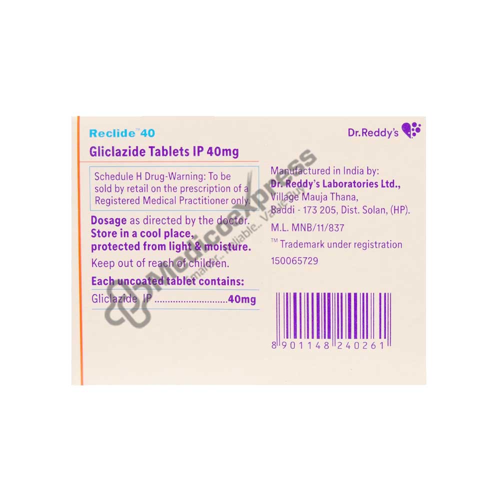 Reclide 40 Tablet 15s is a member of the "oral hypoglycemic" medication class that is used to treat type 2 diabetes mellitus when diet and exercise are insufficient to manage blood sugar levels. A chronic or permanent condition called type 2 diabetes changes how our bodies use glucose. Type 2 diabetics either do not create enough insulin or the insulin they do make does not act properly in the body (insulin resistance). Type 2 diabetes is commonly referred to as adult-onset diabetes since it is most common in middle-aged or older people. Gliclazide is a component of Reclide 40 Tablet 15. It functions by raising the pancreas's output of insulin. It lowers blood sugar levels and induces the pancreas to secrete more insulin.Disclaimer:For more information contact your physician.