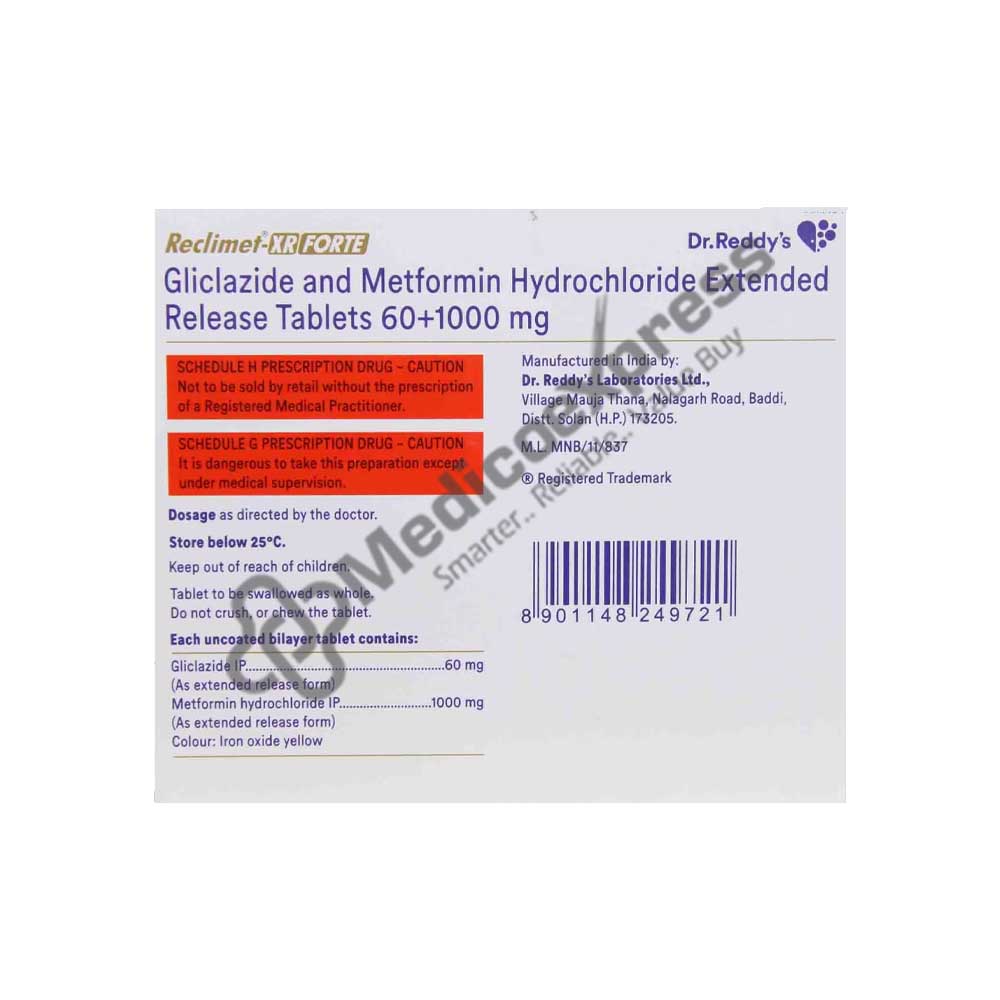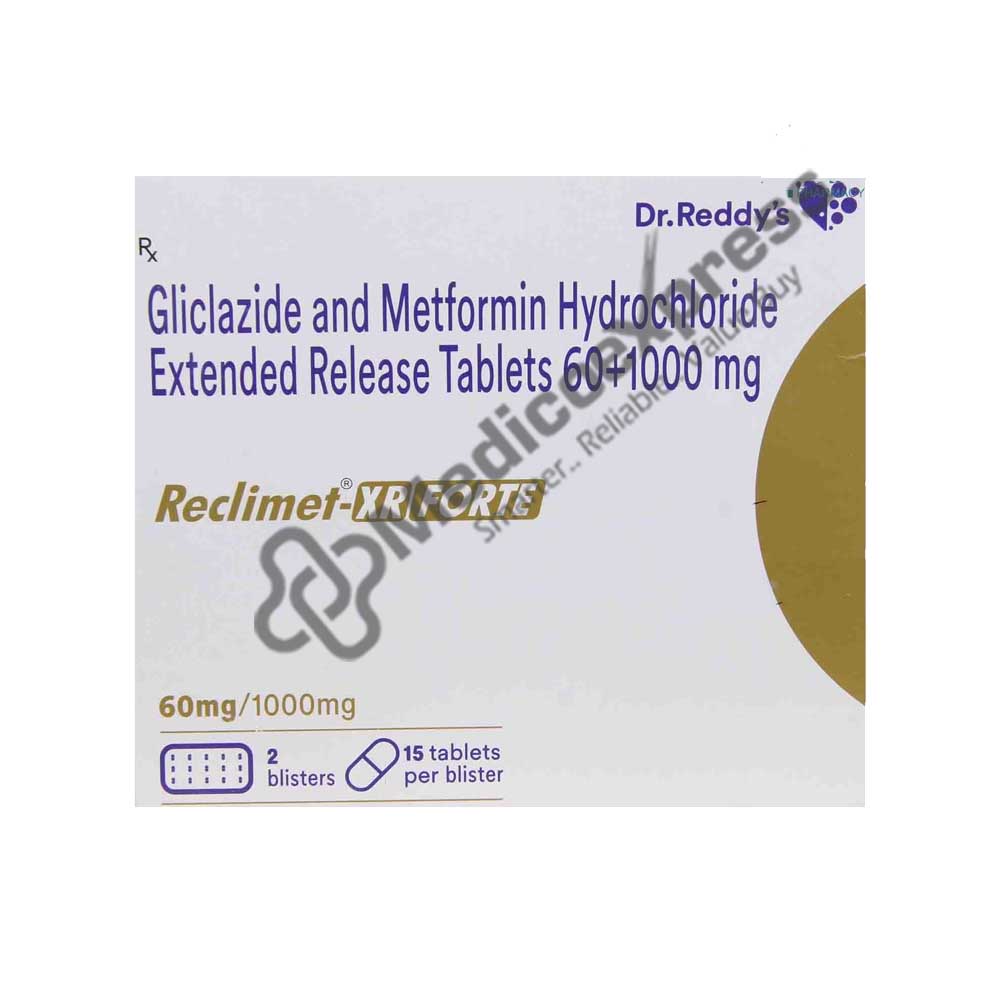 Reclimet XR Forte Tablet 15's is a member of the anti-diabetic drug subclass. The main purpose of it is to cure Type 2 diabetes. A chronic or lifelong disease, type 2 diabetes affects how your body uses glucose. When a person has type 2 diabetes, their body either does not create enough insulin or, if it does, it cannot work properly in the body (insulin resistance). This causes the blood glucose level to rise, which in turn causes symptoms like frequent urination, increased thirst, and increased hunger. Serious side effects such skin infections, eye issues, nerve damage, diabetic foot (foot ulcers), kidney illness, high blood pressure, and even stroke can result from it.Disclaimer:For more information contact your physician.