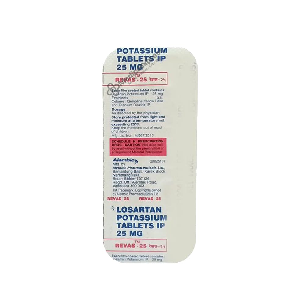 Revas-25 Tablet 10 belongs to the angiotensin II receptor blocker class of drugs, which are used to treat high blood pressure (hypertension) and lower the risk of stroke in certain people with heart disease. Hypertension is a medical condition in which blood pressure in the arteries is consistently elevated (140/90). Heart failure is a chronic condition in which the heart is unable to effectively pump blood.Disclaimer:For More Information Contact Your Physician