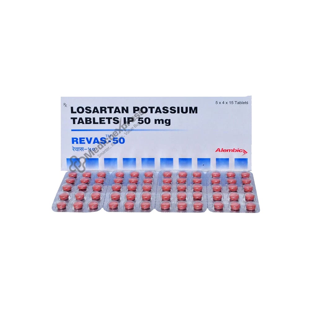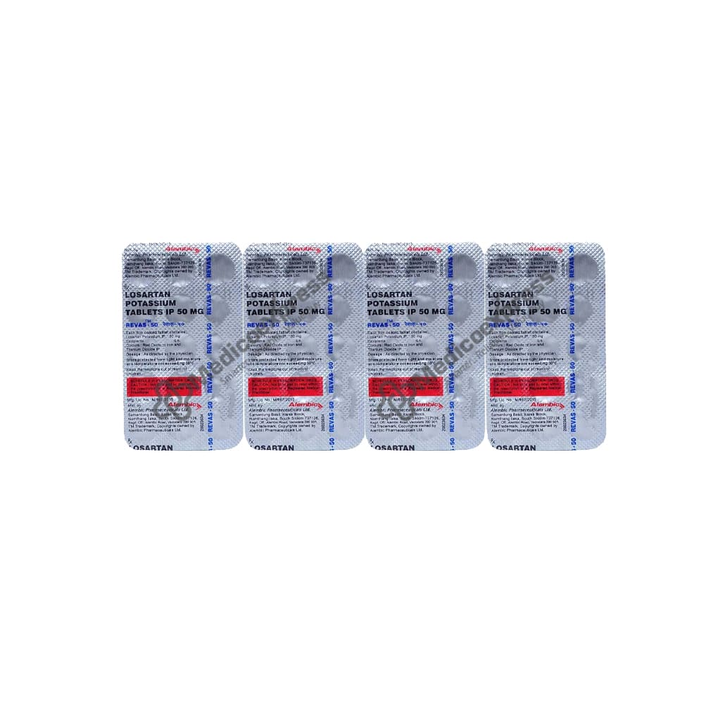 Revas 50 Tablet 15s belongs to the angiotensin II receptor blocker class of drugs, which are used to treat high blood pressure (hypertension) and lower the risk of stroke in certain people with heart disease. Hypertension is a medical condition in which blood pressure in the arteries is consistently elevated (140/90). Heart failure is a chronic condition in which the heart is unable to effectively pump blood.Disclaimer:For More Information Contact Your Physician