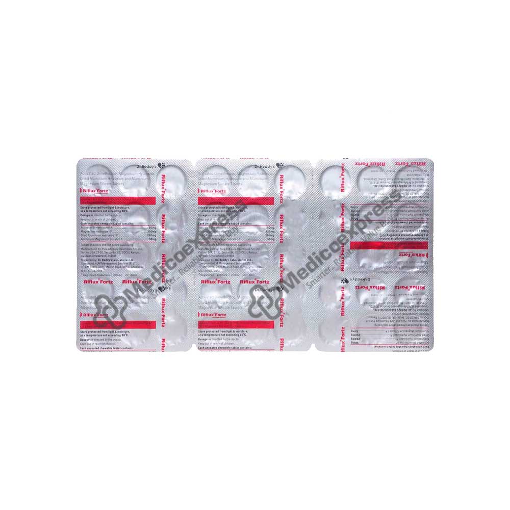 Riflux Fortz Tablet 15'S requires a prescription. Heartburn, acid reflux, and stomach ulcers can all be treated with it. It eases symptoms including stomach ache or irritability. Additionally, it aids in balancing and letting go of stomach gas that has built up. Three medications are included in each Riflux Fortz Chewable Tablet. Follow your doctor's advice regarding the dosage and duration of this medication. It should be consumed orally before meals, ideally before bed. Take this medication as soon as you remember if you happen to miss a dose. Always finish the recommended course of treatment. A higher dose of this medication should not be taken since it may have negative effects on the body. The majority of people tolerate this medication well.Disclaimer:For more information contact your physician.