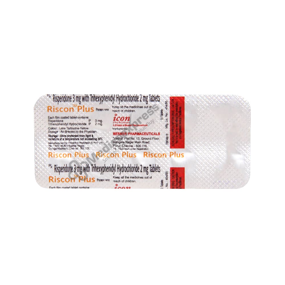 Riscon plus tablet 10's an antipsychotic medication used to treat schizophrenia and acute manic episodes (irritable mood, having suicidal thoughts).Disclaimer:For more information contact your physician