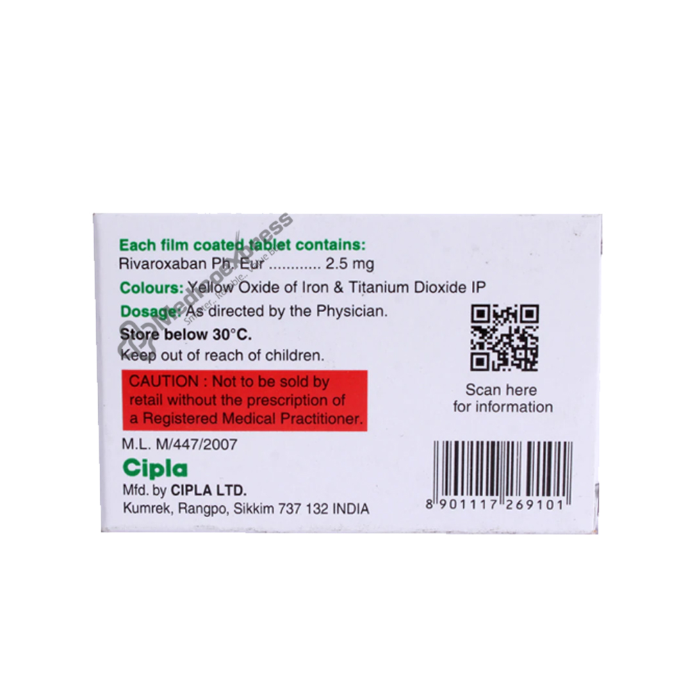 RIVAZEST 2.5 TABLET contains Rivaroxaban, a medication in the Antithrombotic agent class. It is employed in the treatment of deep vein thrombosis (DVT), pulmonary embolism (PE), and venous thromboembolism (VTE). It is also used to lower the risk of stroke, systemic embolism in nonvalvular atrial fibrillation, DVT or PE recurrence, major cardiovascular events in patients with coronary artery disease (CAD), and major thrombotic vascular events in patients with peripheral artery disease (PAD) (PAD). Venous thromboembolism is a condition caused by the formation of clots in the venous circulation.Disclaimer:For More Information Contact Your Physician