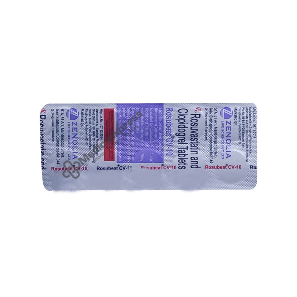 Rosubeat Cv-10Mg Tab 10'S a Combination Medicine Made Up Of a Blood Thinner And a Cholesterol-Lowering Agent That Is Primarily Used To Prevent Future Heart Attacks And Strokes.Disclaimer:For More Information Contact Your Physician