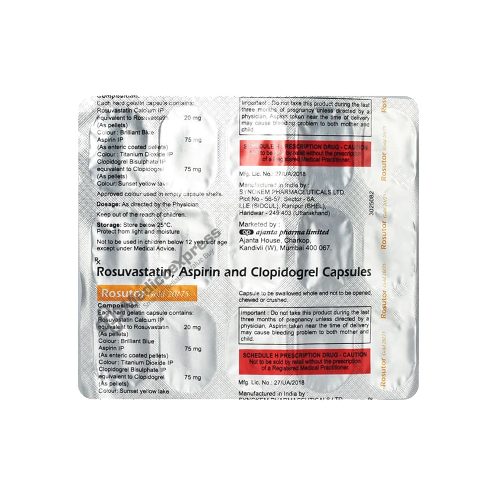 Rosutor Gold 20/75 Capsule 15 belongs to a class of antihyperlipidemic and antiplatelet drugs used to treat heart attacks, myocardial infarction (blockage of blood flow to the heart muscles), angina (chest pain), and stroke. A heart attack occurs when the blood supply to the heart is cut off.Disclaimer:For More Information Contact Your Physician