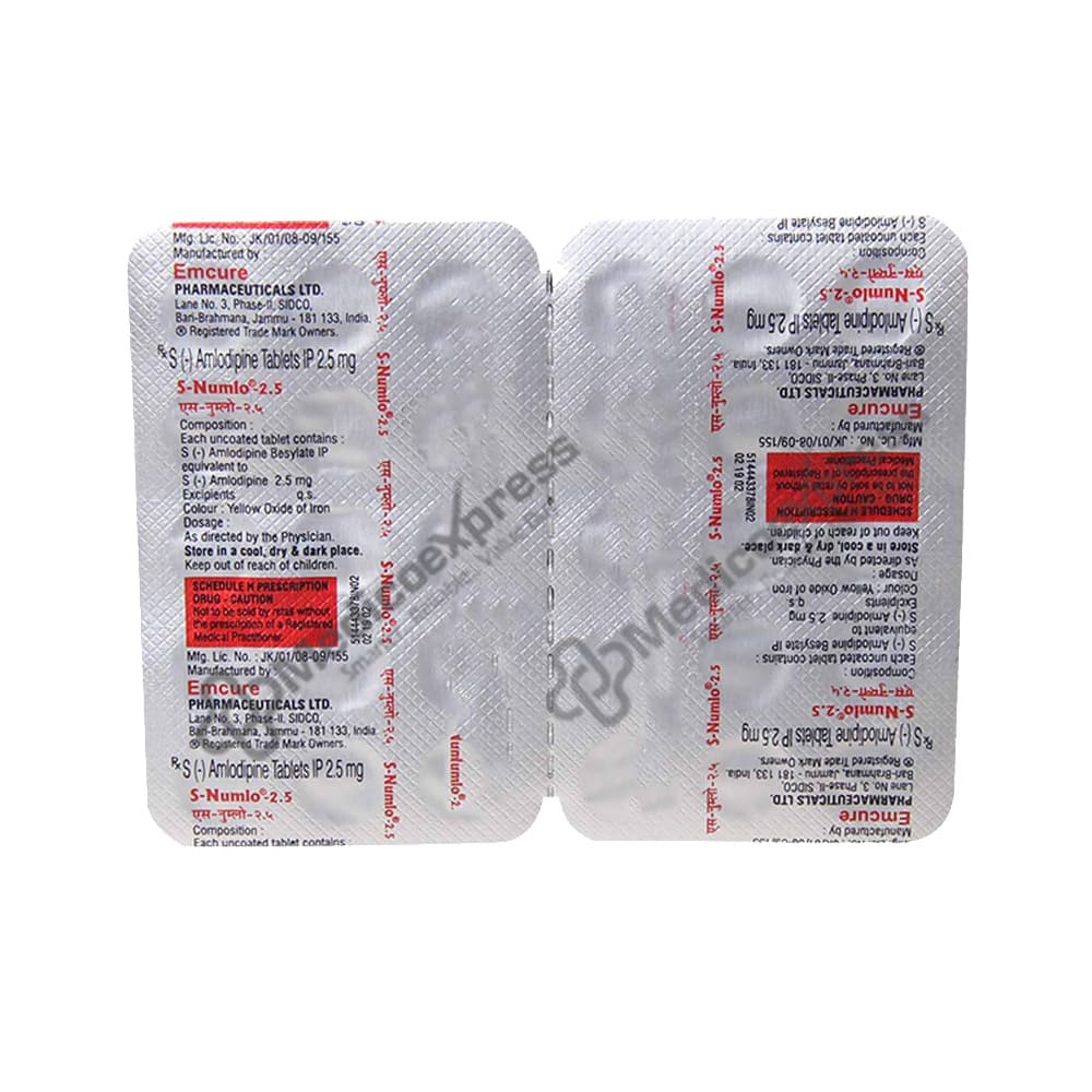 S-numlo 2.5 tablet 15's a calcium channel blocker medication that is used to treat hypertension (high blood pressure) and angina (chest pain).Disclaimer:For more information contact your physician