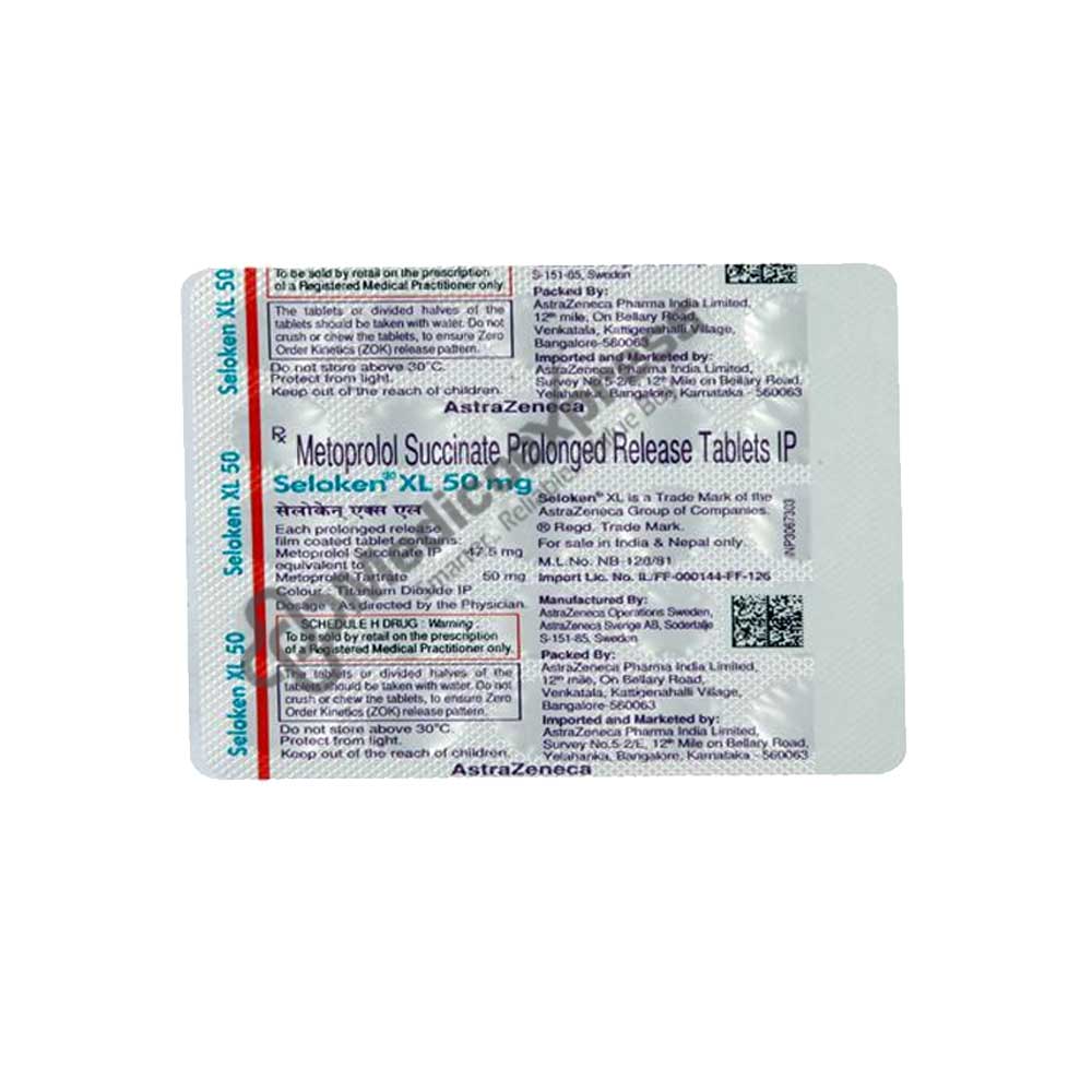 Seloken XL 50 mg Tablet 30's is a beta-blocker medication that is used to treat high blood pressure (hypertension), heart-related chest pain (angina), irregular heart rhythm (arrhythmia), and to protect the heart after a heart attack (myocardial infarction). Hypertension, also known as high blood pressure, is a chronic condition in which the blood exerts an increased pressure on the arteries, potentially leading to a variety of heart diseases. Furthermore, it may aid in the relief of migraine-related headaches and tremors (fits).Disclaimer:For More Information Contact Your Physician