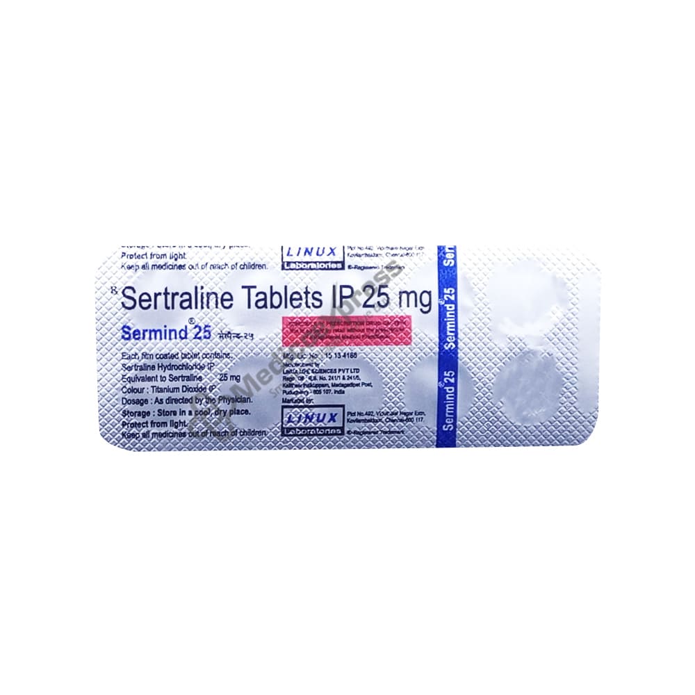 Sertraline, found in Sermind 25mg Tablet 10'S, belongs to a class of drugs known as Selective Serotonin Reuptake Inhibitors. It is used to treat anxiety and/or depression disorders. It works by increasing serotonin levels in the brain, which helps to stabilise our mood, feelings of well-being, and happiness.Disclaimer:For More Information Contact Your Physician