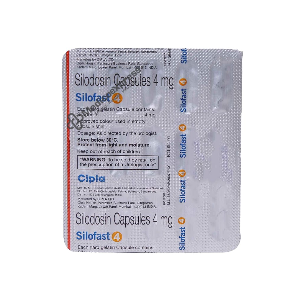 Silofast 4 Capsule 15's is an alpha-blocker medication used to treat the symptoms of an enlarged prostate gland (benign prostatic hyperplasia - BPH) in men. Benign prostatic hyperplasia (BPH) is a condition in which the prostate gland enlarges due to cell multiplication, most commonly in men over the age of 50. Prostate gland growth is non-cancerous in nature.Disclaimer:For More Information Contact Your Physician