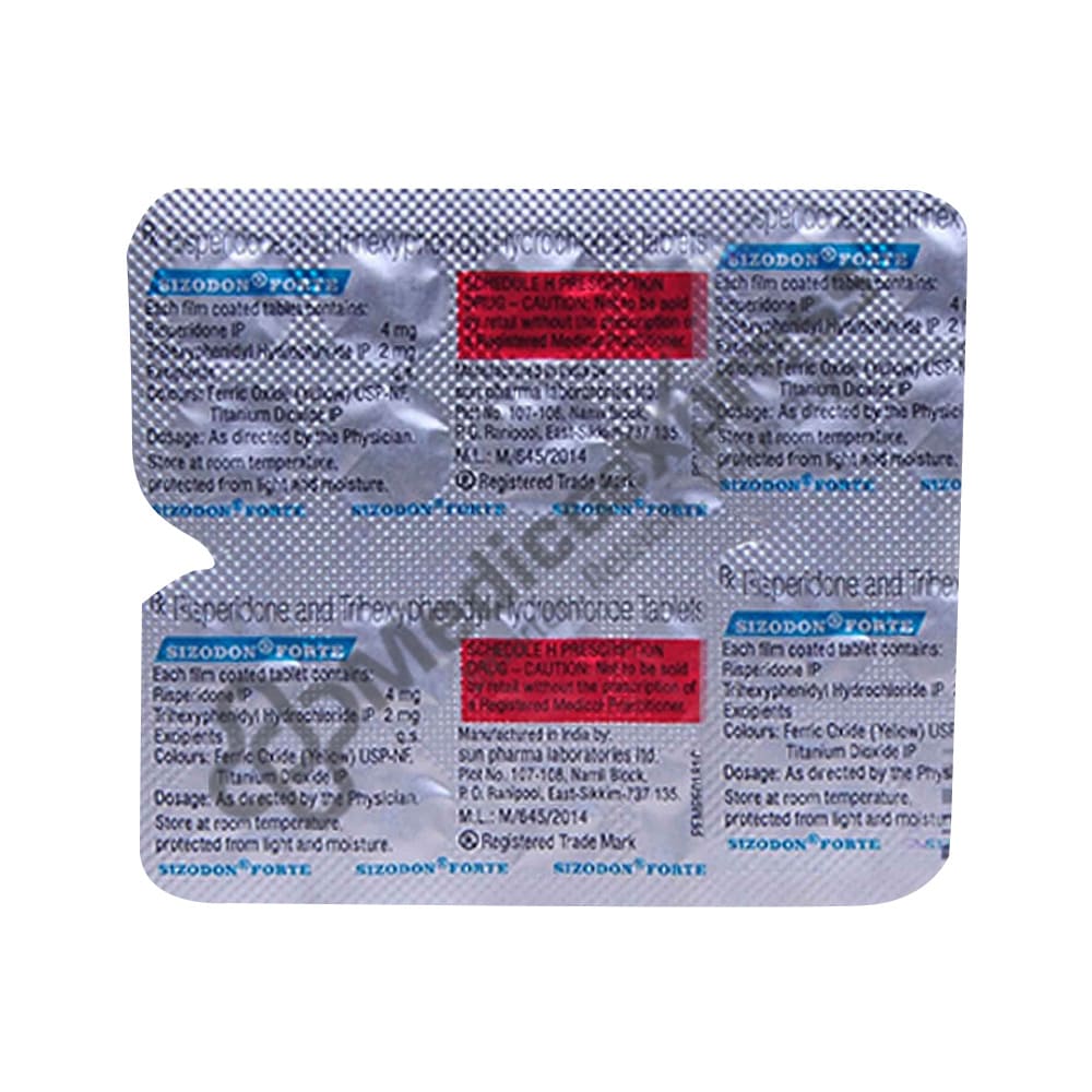 Sizodon Forte Tablet is a combination medication that is used to treat schizophrenia. It works by influencing the activity of certain chemical messengers in the brain that influence thoughts.Disclaimer:For More Information Contact Your Physician