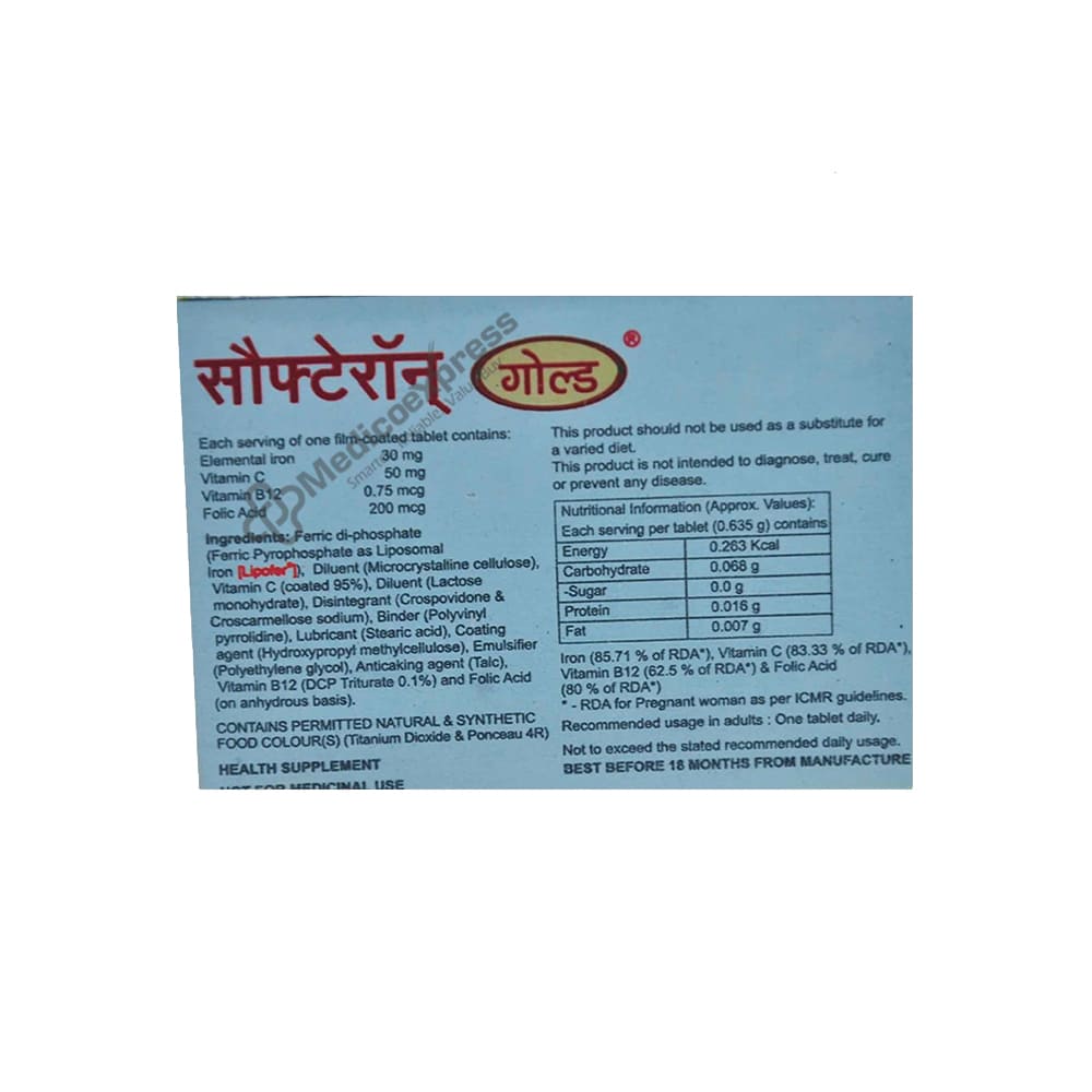Softeron gold tablet is a dietary supplement that provides important minerals and vitamins that aid in the body's wellness. Iron is required for all cells in the human body to operate properly. It is necessary for the creation of blood in the human body. It aids in the transportation of oxygen to the body's cells and tissues. Iron mixes with a protein known as haemoglobin in red blood cells. Anemia can be caused by an iron shortage in both adults and children.Disclaimer : For More Details, Contact Your Physician