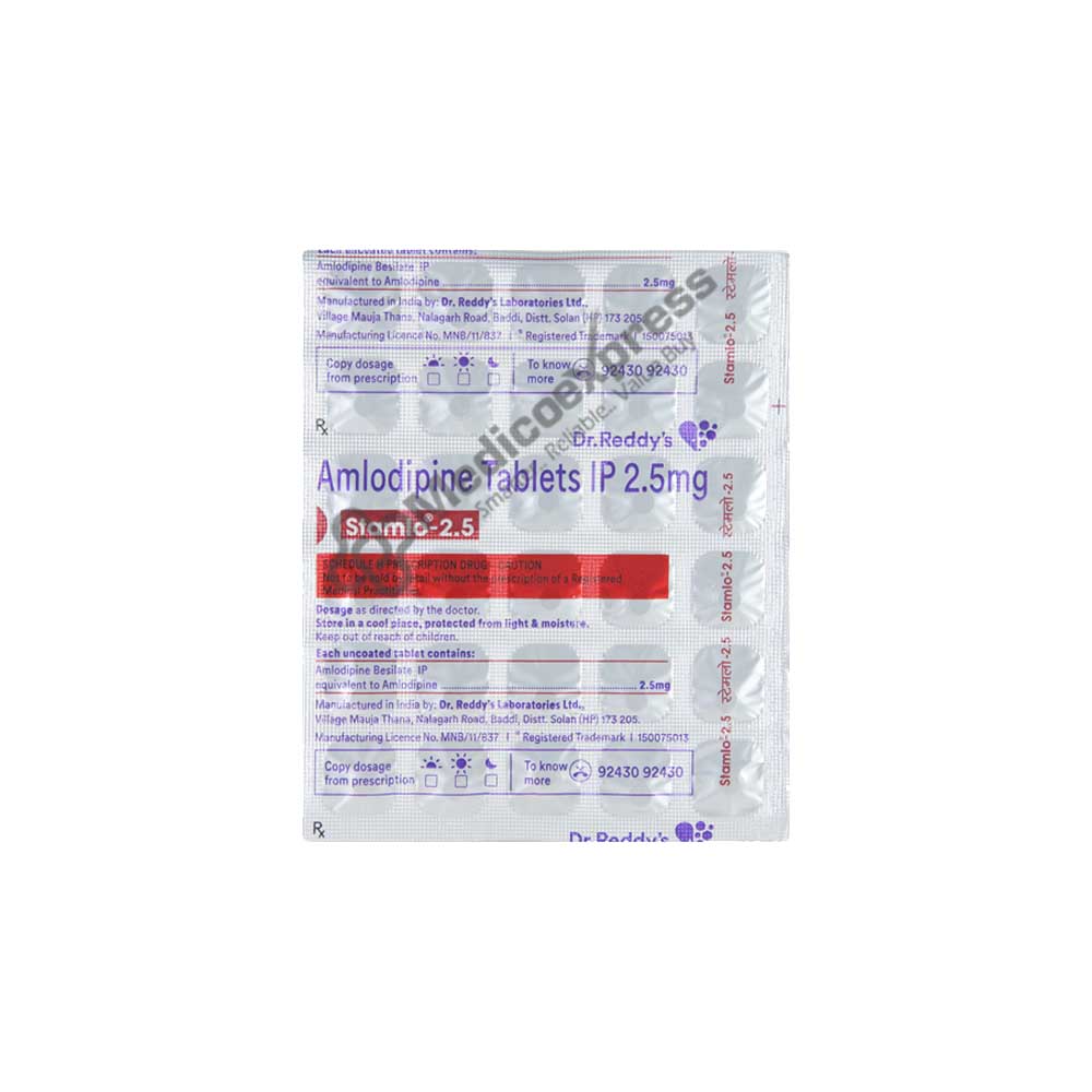 Stamlo 2.5mg tablet 30's contains Amlodipine a component in the hypertension drug . This medication lowers blood pressure and treats a number of cardiac problems, including irregular heartbeat and chest pain (angina). Amlodipine is a calcium channel blocker that relieves heart pressure by allowing the blood vessels to relax. If you recently experienced a heart attack or heart failure, let your doctor know. Take Stamlo 2.5 for the term recommended by your doctor. Stop using this medication only after consulting your doctor. Disclaimer:For more information contact your physician.