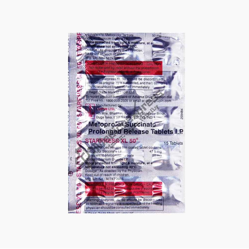Starpress xl 50 tablet 15's an antihypertensive medication that is used alone or in combination with other medications to treat high blood pressure (hypertension), symptoms produced by an overactive thyroid gland, heart related chest discomfort (angina), and heart rhythm disorders (arrhythmia).Disclaimer:For more information contact your physician