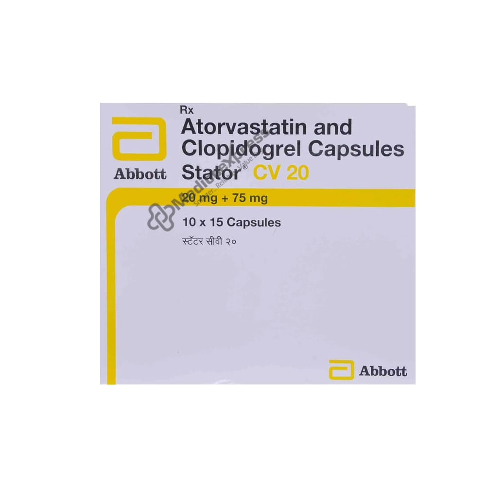Stator CV 20 Capsule 15's is a combination drug made up of a blood-thinning agent and a cholesterol-lowering agent that is primarily used to prevent future heart attacks and strokes. It lowers our bodies' elevated levels of cholesterol and fats (triglycerides).Disclaimer:For More Information Contact Your Physician
