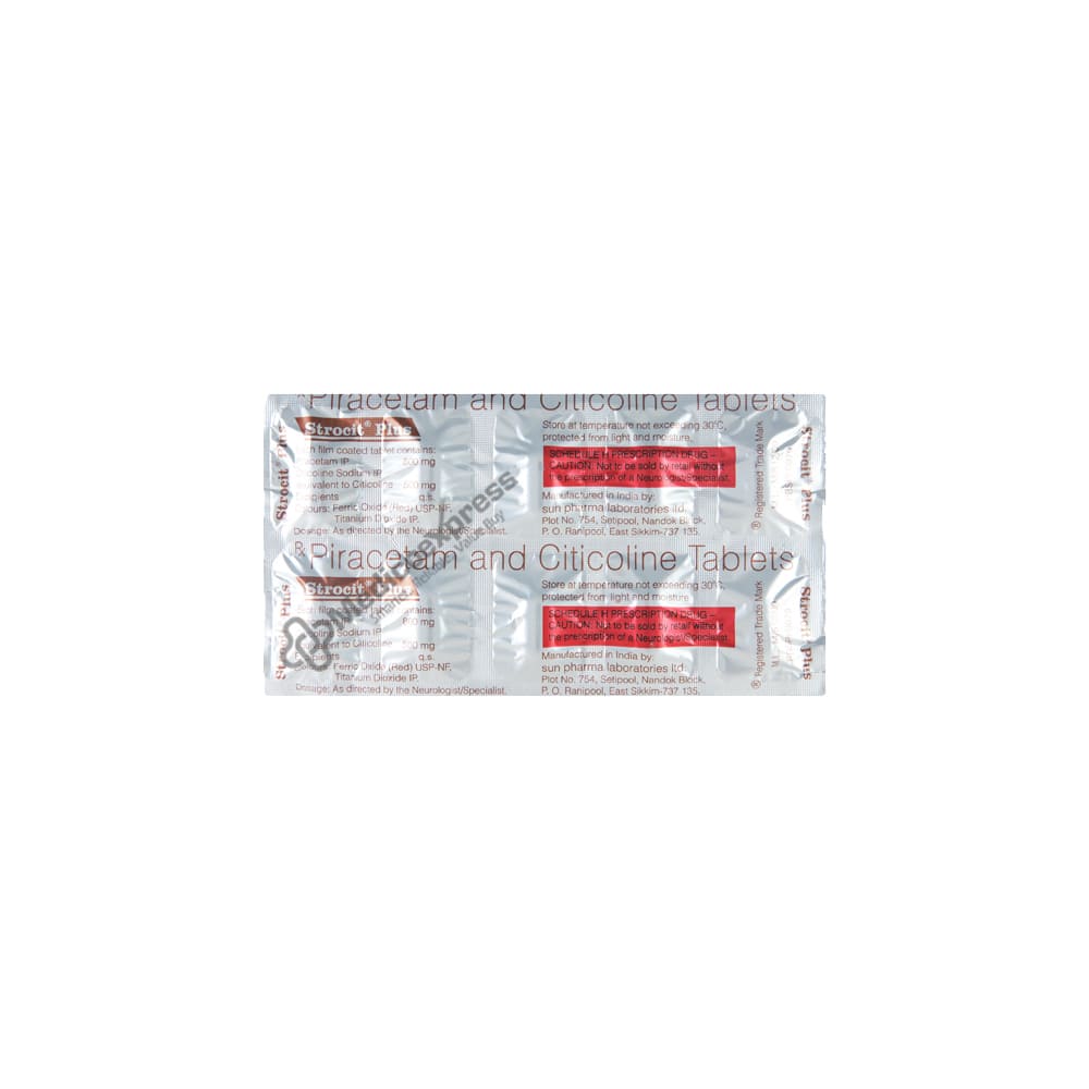 The Strocit Plus Tablet is a combination of two medications used to treat stroke. It protects brain nerve cells from damage and aids in the repair of damaged nerve cells. This medication should only be taken as directed by a doctor.Disclaimer:For More Information Contact Your Physician