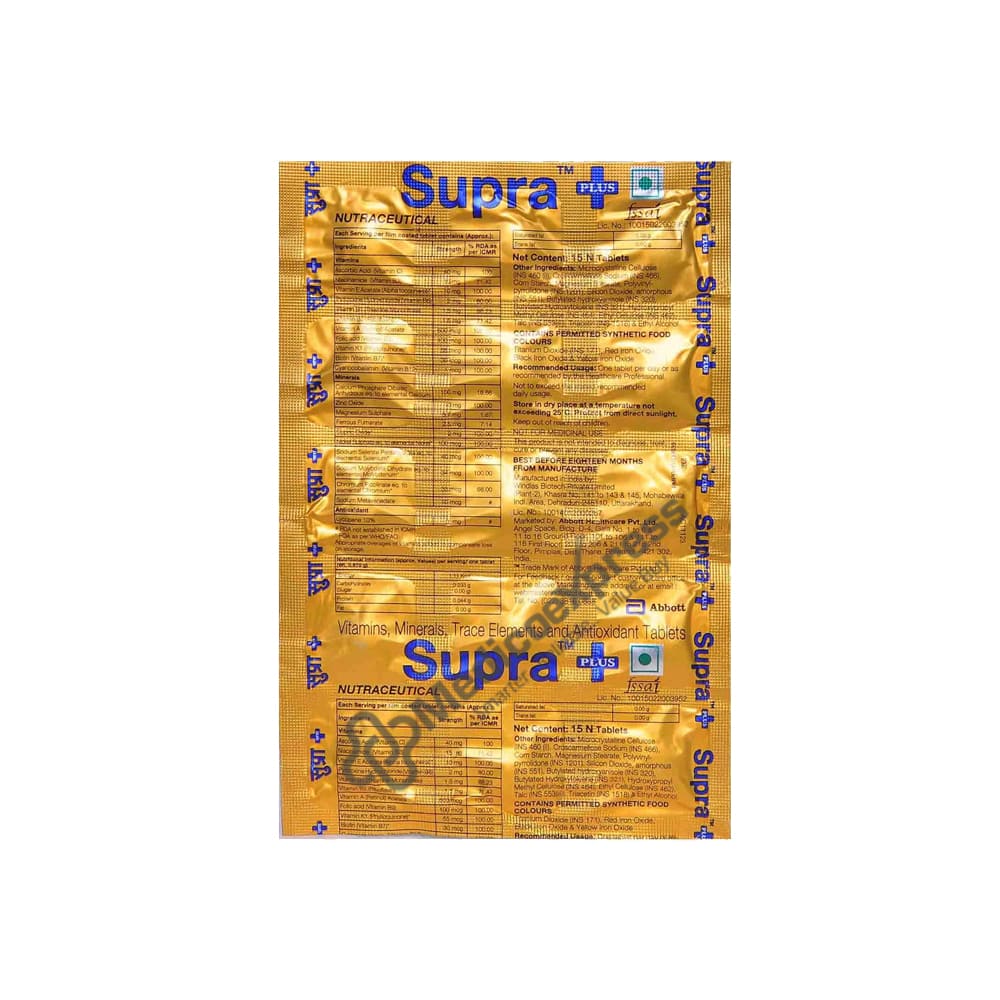 Supra Plus Tablet is employed in the prevention and treatment of nutritional deficiencies. It is used to replenish your body's vitamins and minerals and improve your overall health. It contains ingredients that boost blood circulation and oxygen saturation. The tablet is used to treat anaemia, grey hair, stomach upset, and infections. It strengthens the immune system and aids in the fight against infections. It aids in the reduction of fatigue and the enhancement of performance.Disclaimer:For More Information Contact Your Physician