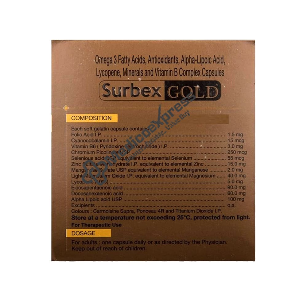 Surbex gold capsule 10’s an excellent nutritional supplement that supplies iron to the blood, vitamins to the body, and promotes normal cell, nerve, muscle, and bone function.\Disclaimer:For more information contact your physician