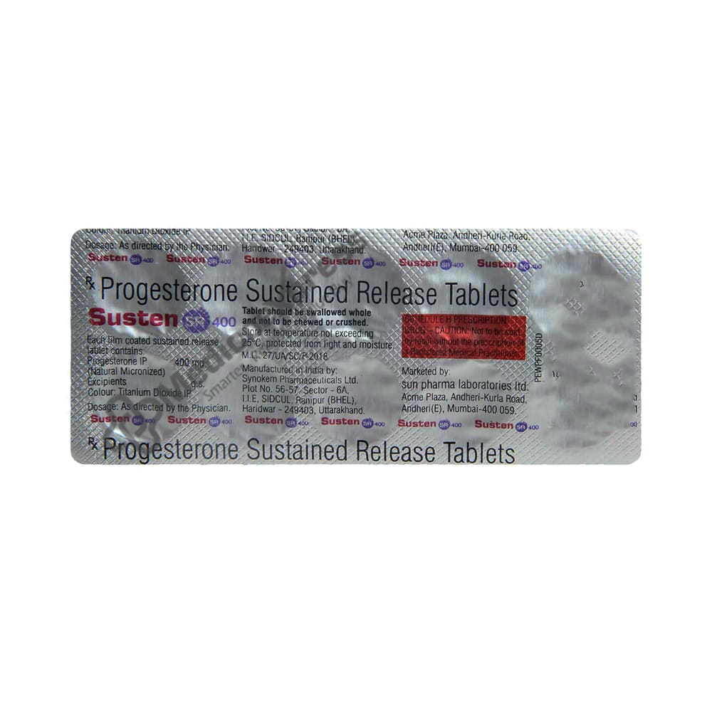 Susten SR 400 Tablet 10's is a female hormone that is primarily used in combination with oestrogen for hormone replacement therapy.Disclaimer:For More Information Contact Your Physician