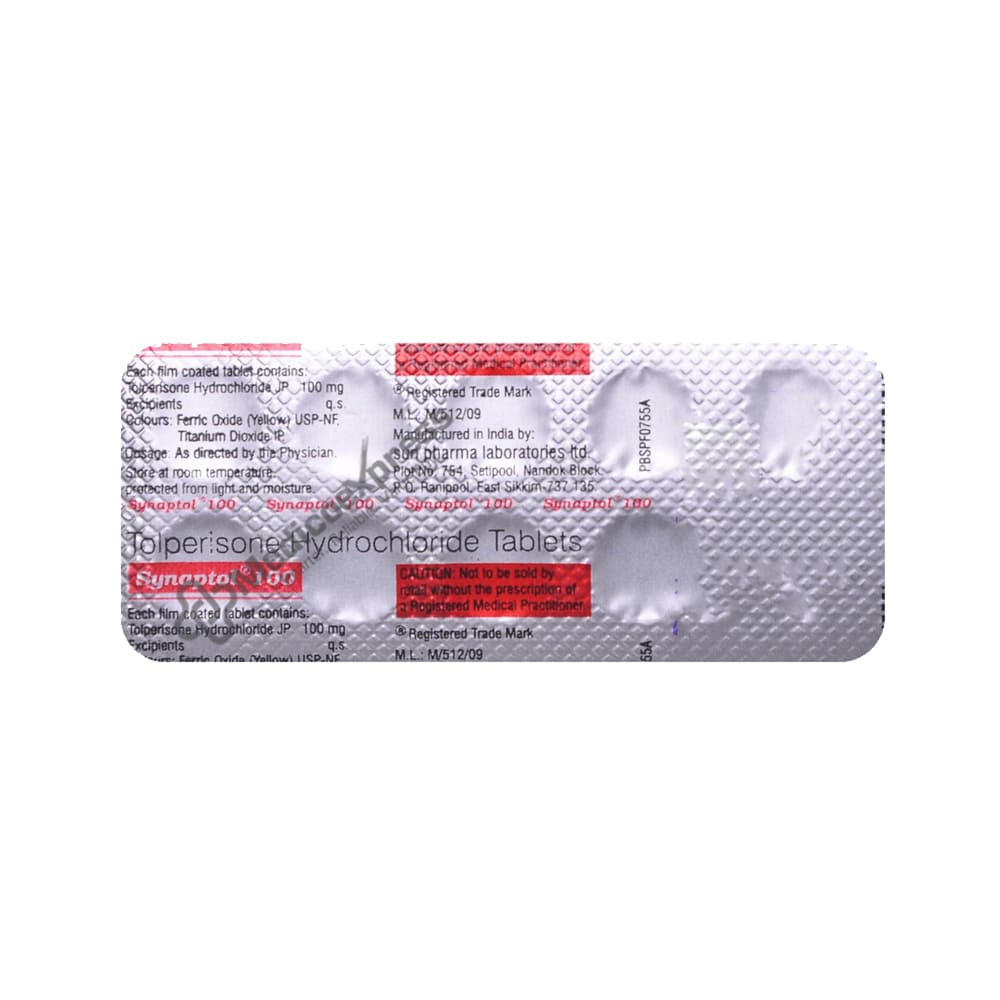 SYNAPTOL 100MG TABLET is a medication in the class of centrally acting muscle relaxants. It is employed in the treatment of acute musculoskeletal pain (pain within the body starts from muscles, bones, or joints).Disclaimer:For More Information Contact Your Physician