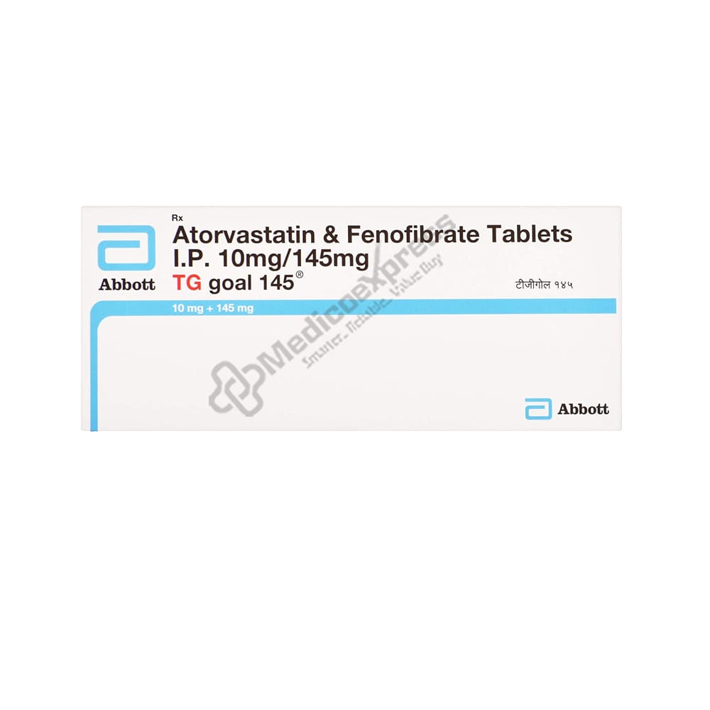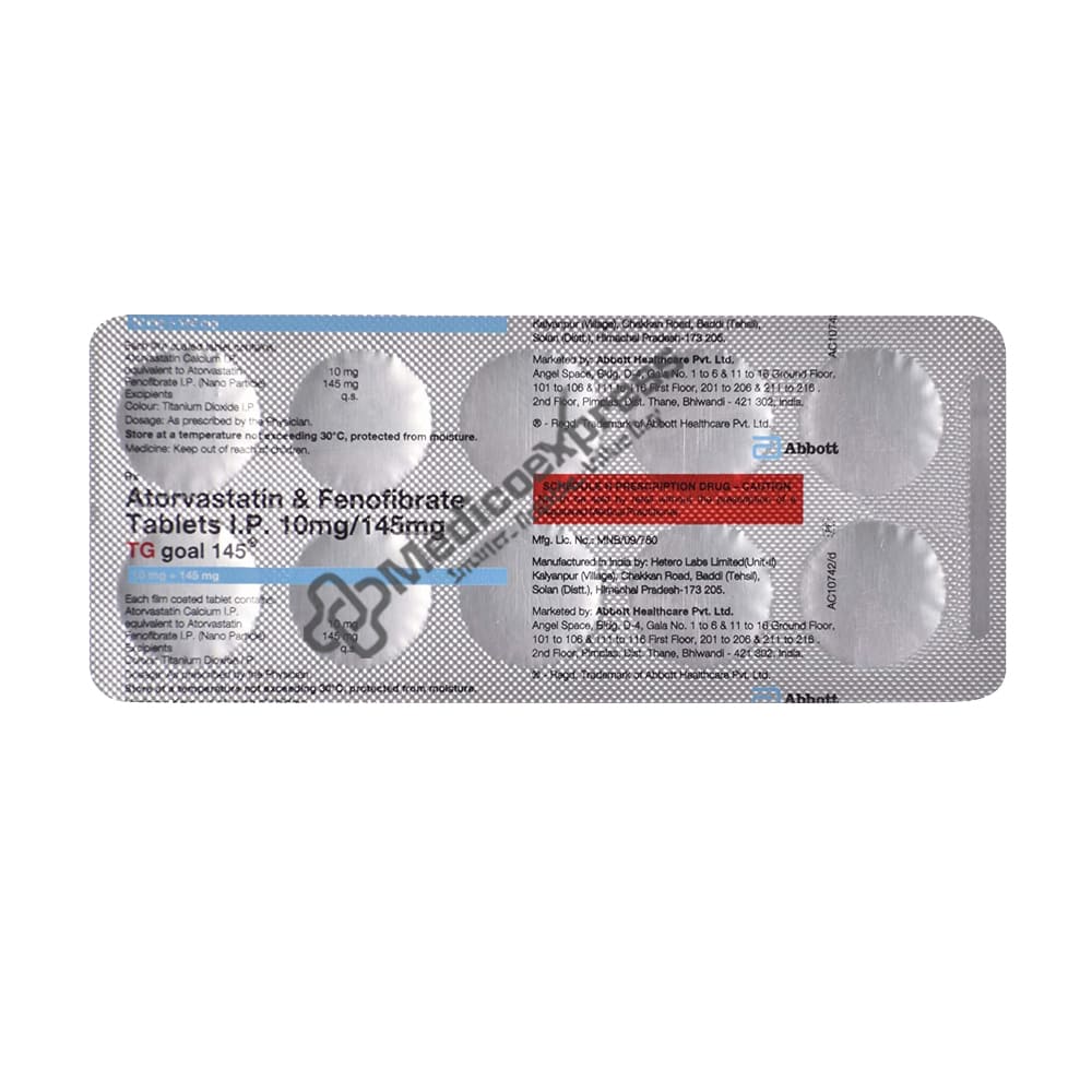 T G Goal 145mg Tablet 10's is a drug combination made up of Atorvastatin and Fenofibrate, both of which lower cholesterol and bad lipids (triglycerides) in the blood and are primarily used to prevent heart disease and blood vessel blockage.Disclaimer:For More Information Contact Your Physician