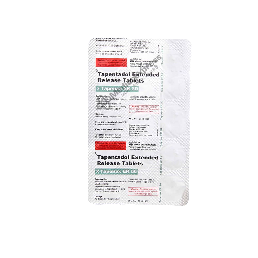 Tapenax ER 50 Tablet is an adult pain reliever that is used to treat moderate to severe acute pain. It is used to treat a variety of ailments, including headaches, fevers, period pain, toothaches, and colds. It effectively relieves pain when other treatments fail to do so.Disclaimer:For More Information Contact Your Physician