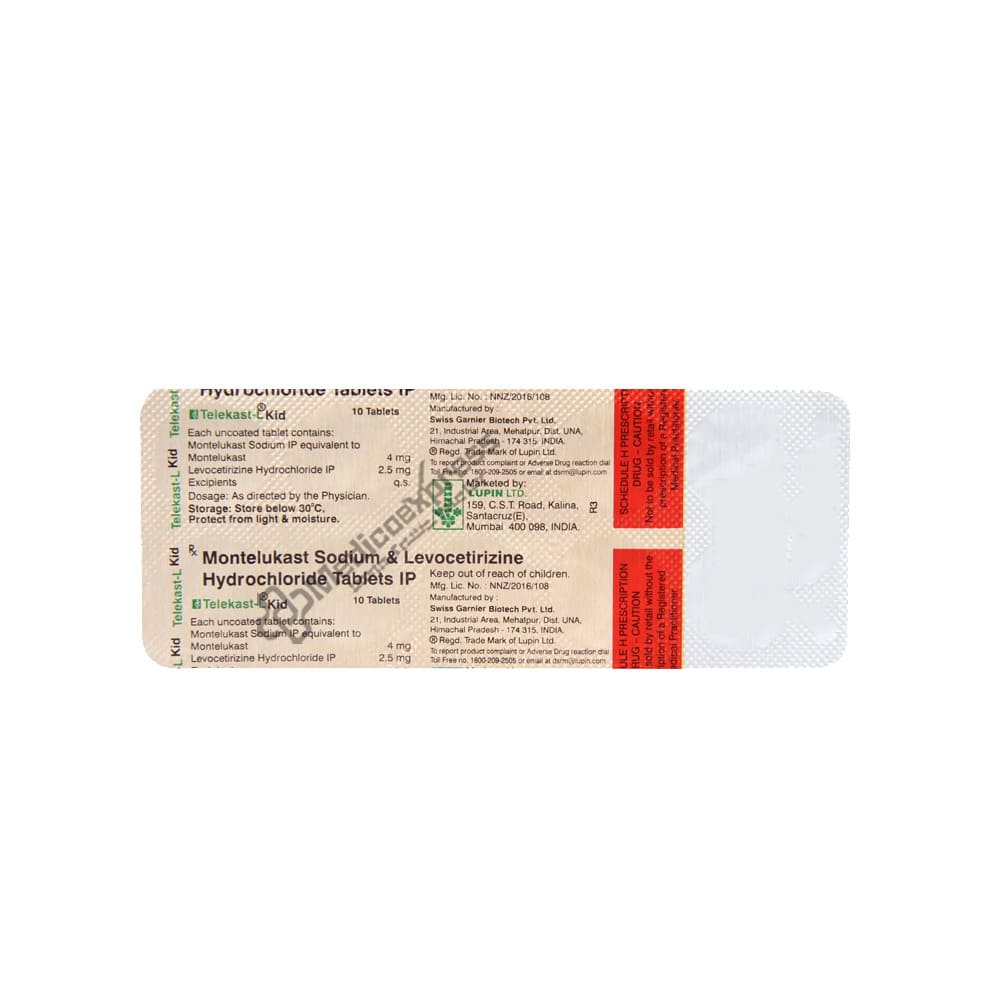 Telekast L Kid Tablet 10's Is a Mixture Of Anti Allergic Treatments That Includes Two Medications: Levocetirizine And Montelukast, Which Are Primarily Used To Treat Allergic Symptoms. Levocetirizine Inhibits The Effects Of a Chemical Messenger Known As 'Histamine,' Which Is Naturally Implicated In Allergic Reactions.Disclaimer:For More Information Contact Your Physician