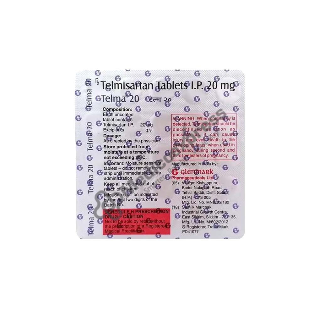 TELMA 20MG TABLET includes Telmisartan, a medication from the class of drugs known as Angiotensin II receptor antagonists. Adults with necessary hypertension are treated with it. Essential hypertension is high blood pressure that is not a symptom of any other illness. It is characterised by signs and symptoms like morning headaches, nosebleeds, irregular heartbeat, changes in vision, buzzing in the ears, fatigue, nausea, and chest pain.Disclaimer : For More Details, Contact Your Physician