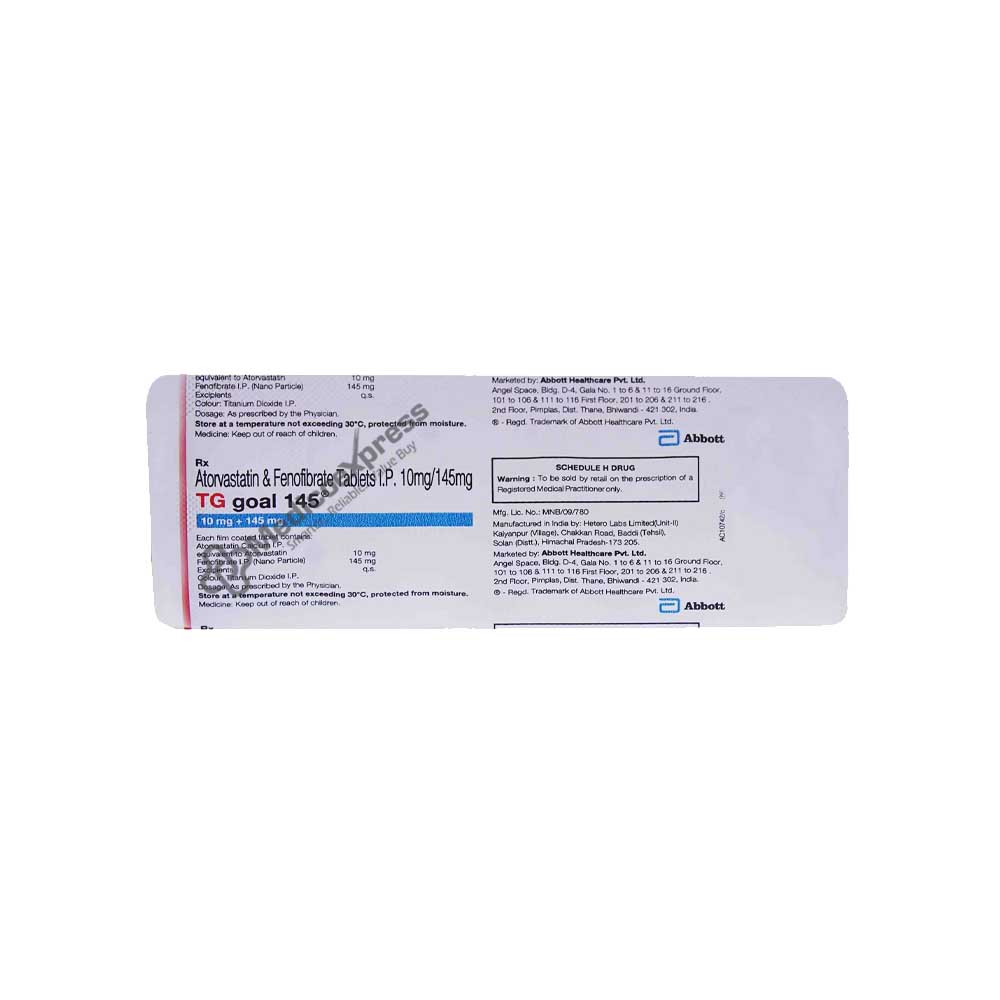 TG Goal 145 mg Tablet 10's, which is primarily used to treat high lipid levels (cholesterol and triglycerides levels) and avoid heart disease and blood vessel blockage. High levels of low-density lipoproteins (LDL), or bad cholesterol, and low levels of high-density lipoprotein (HDL), or good cholesterol, are symptoms of hyperlipidemia, also known as hypertriglyceridemia. A higher amount of poor cholesterol increases the risk of future heart attacks and strokes, particularly in people with heart disease.The two medications Atorvastatin (HMG-CoA reductase inhibitor) and Fenofibrate make up TG Goal 145 Tablet 10's (fibrates). Atorvastatin is a lipid-lowering drug that prevents the production of cholesterol by blocking the enzyme HMG-CoA reductase.Disclaimer:For more information contact your physician.