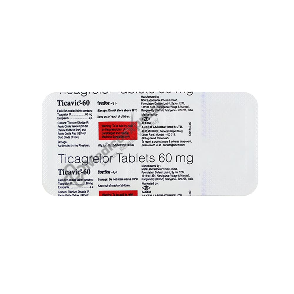 Ticavic 60 mgTablet 10s are an antiplatelet medication (blood thinner) used primarily to protect those with a high risk of heart disease from having a heart attack or stroke. People with acute coronary syndrome (heart doesn't get enough oxygen) who have had stents put in blood vessels in their heart benefit from Ticavic 60 mg Tablet 10's ability to avoid blood clots. When a blood clot obstructs the heart's blood supply, a heart attack takes place. Plaque, which forms in the arteries supplying the heart, is frequently the cause of this artery obstruction as a result of an accumulation of cholesterol, fat, and other chemicals (coronary arteries). Chest pain, pain in the upper body, perspiration, nausea, exhaustion, and problems breathing are all indications of a heart attack. Ticagrelor, a blood thinner, is present in Ticavic 60 mg Tablets, 10 of them.Disclaimer:For more information contact your physician.