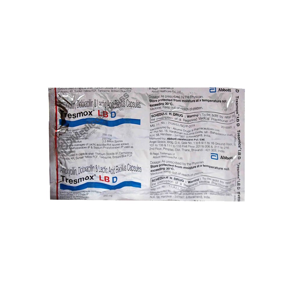Tresmox LB D Capsule 10 is an antibiotic that is used to treat bacterial infections of the ear, nose, throat, skin, urinary tract, tonsillitis, bronchitis, and pneumonia.Disclaimer:For More Information Contact Your Physician