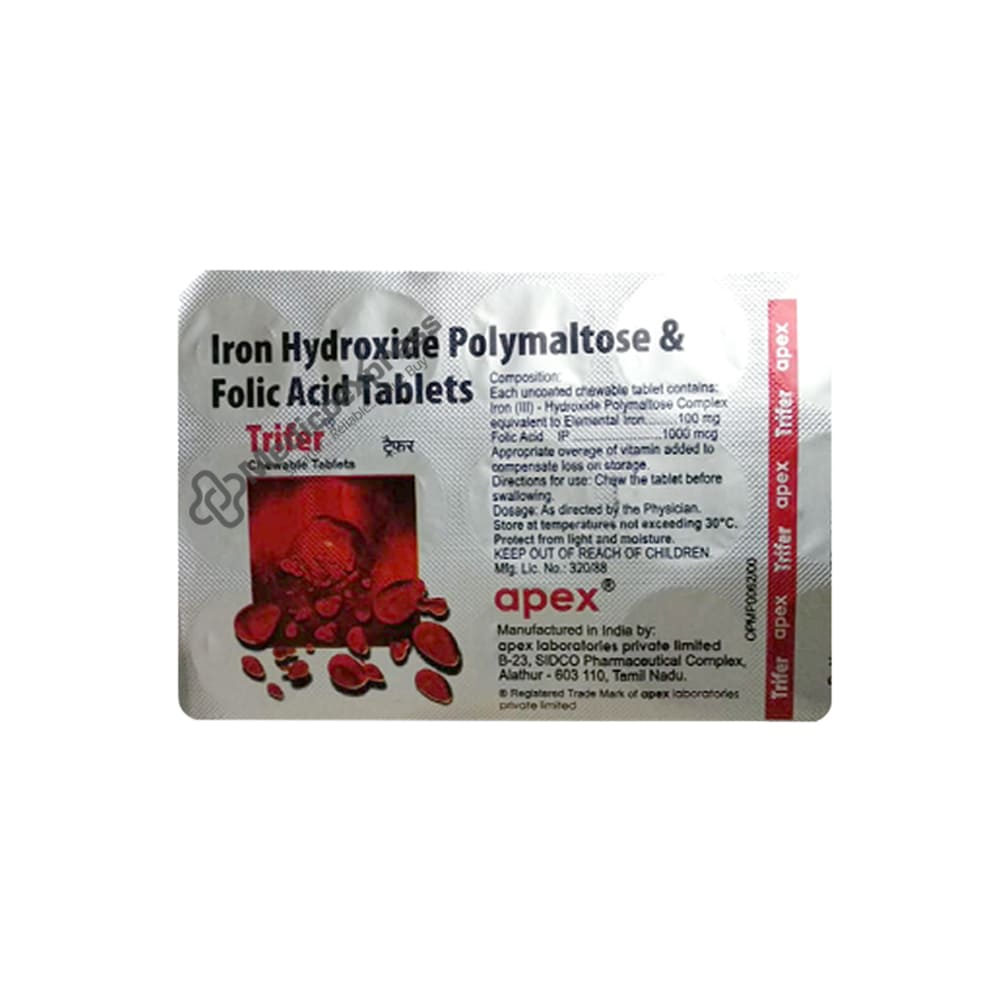Trifer Chewable Tablet 15's are part of a group of drugs known as "haematinics," which are generally used to treat anaemia (deficiency of iron and haemoglobin). Poor nutrition, inadequate nutrient absorption, or excessive body folate utilisation are the main causes of its insufficiency (in pregnancy). Anaemia is a disorder when the body lacks enough red blood cells to provide the necessary oxygen to the body's various tissues. Disclaimer:For more information contact your physician.