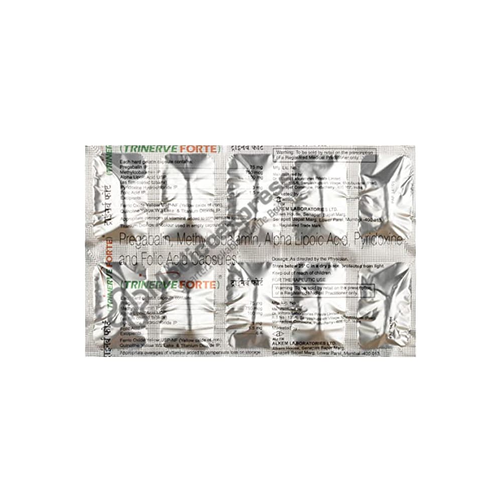 Trinerve Capsule 10's is used to treat diabetic neuropathy and neuropathic pain. It maintains the levels of certain vitamins, including vitamin E and vitamin C, in the body and guards against particular cells in the body from deterioration. It efficiently breaks down the body's stored carbs and transforms them into useful energy. By decreasing the development of arterial plaque, alpha lipoic acid reduces the risk of LDL oxidation. A powerful antioxidant that eliminates free radicals and lowers stress is gamma linolenic acid, a fatty acid that can be gained through food or supplementation. It is also known as omega-6 fatty acid, which is necessary for human health but that the body cannot produce on its own. It is very significant for brain function.Disclaimer:For more information contact your physician.
