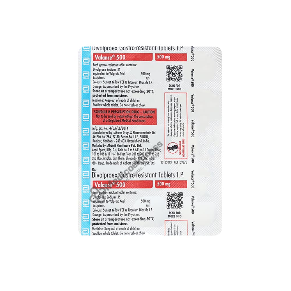 Valance 500 Tablet 15's is an anticonvulsant or anti-epileptic medication used to treat epilepsy/seizures/fits. It also treat bipolar disorder and prevent migraine symptoms (like a headache). Epilepsy is characterised by a surge of electricity in the brain.Disclaimer:For More Information Contact Your Physician