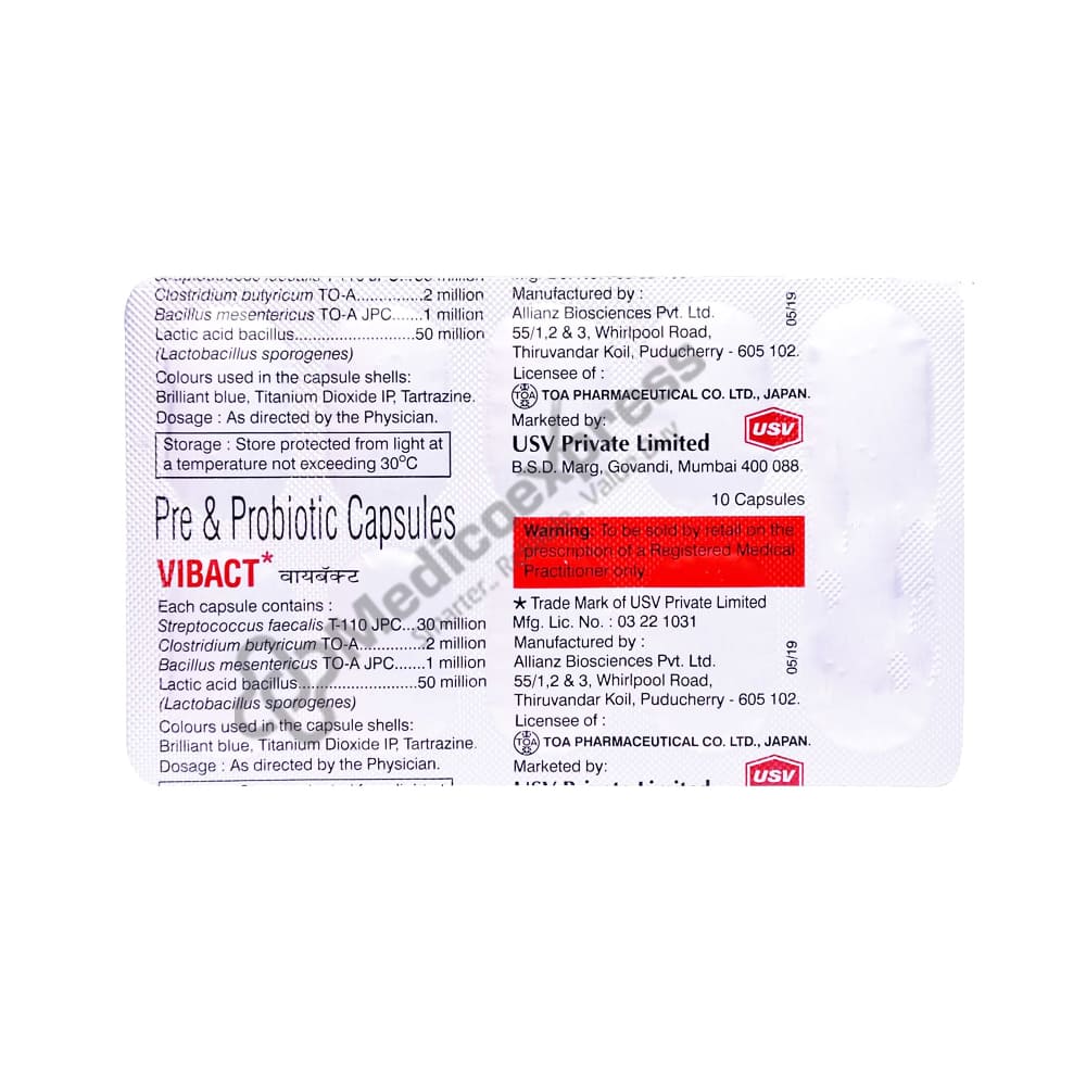 Vibact Capsule 10’s is a medication that combines 'penicillin antibiotics' with probiotics.Disclaimer:For More Information Contact Your Physician