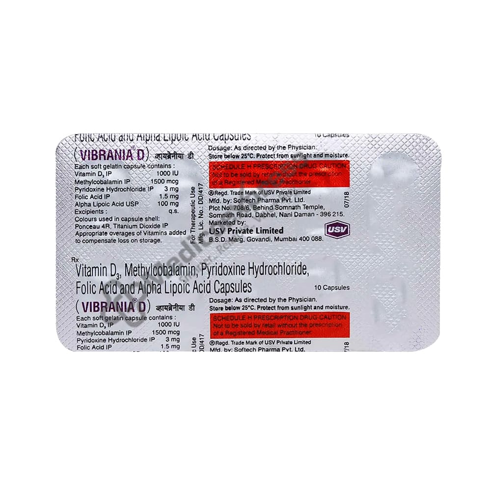 Vibrania D Capsule 10’s is a 'Vitamin' that is primarily used to correct nutritional deficiencies.Disclaimer:For More Information Contact Your Physician