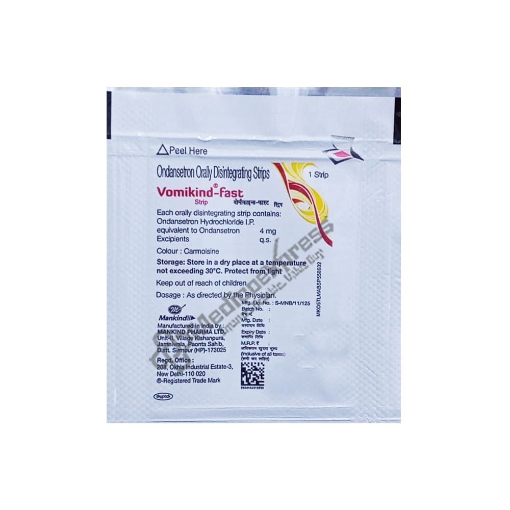 Vomikind-Fast Strip 4 mg is frequently used to manage nausea and vomiting brought on by disorders like stomach discomfort. Additionally, it is used to stop nausea and vomiting brought on by radiotherapy, chemotherapy, or any other type of surgery. Vomikind-Fast Strip may be used with or without food and either alone or in combination with other drugs. Depending on what you are taking it for, your doctor will advise you on the optimum dosage. Typically, the first dose is administered prior to the beginning of the operation, the chemotherapy, or the radiotherapy. After these therapies, follow your doctor's instructions for any additional dosages (normally only for a few days at most). To reap the greatest benefits, take it consistently at the same time(s) each day.Disclaimer:For more information contact your physician.