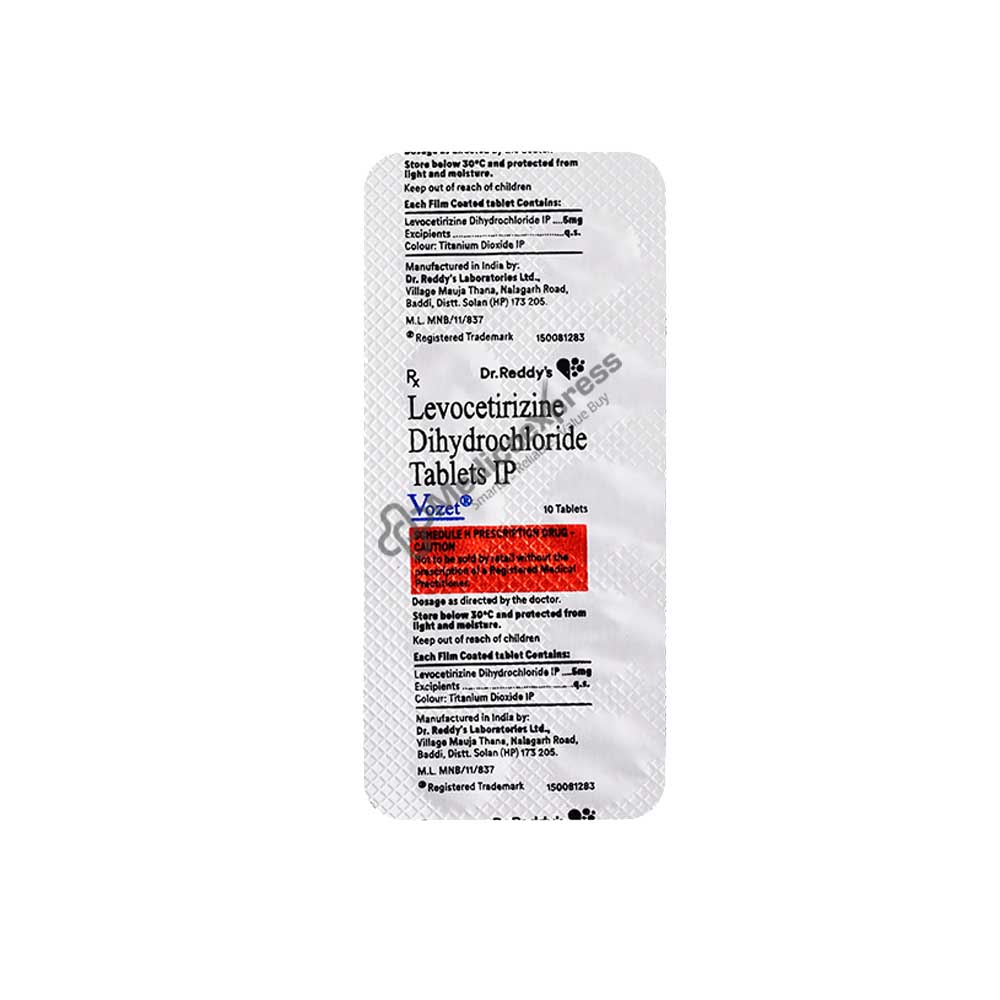 Vozet 5 Mg Tablet 10'S is a member of the class of drugs known as antihistamines. It is used to treat a number of allergic diseases, including hay fever, conjunctivitis, eczema, hives, and reactions to stings and bites. Additionally, it stops itching, sneezing, runny nose, and watery eyes. You can take Vozet Tablet with or without food. Depending on what you are taking it for, you may need a different dose. Although this medication is typically used in the evening, always take it as directed by your doctor. If you are taking this medication to avoid symptoms, you should take it regularly even if you only need it on days when you have symptoms.Disclaimer:For more information contact your physician.