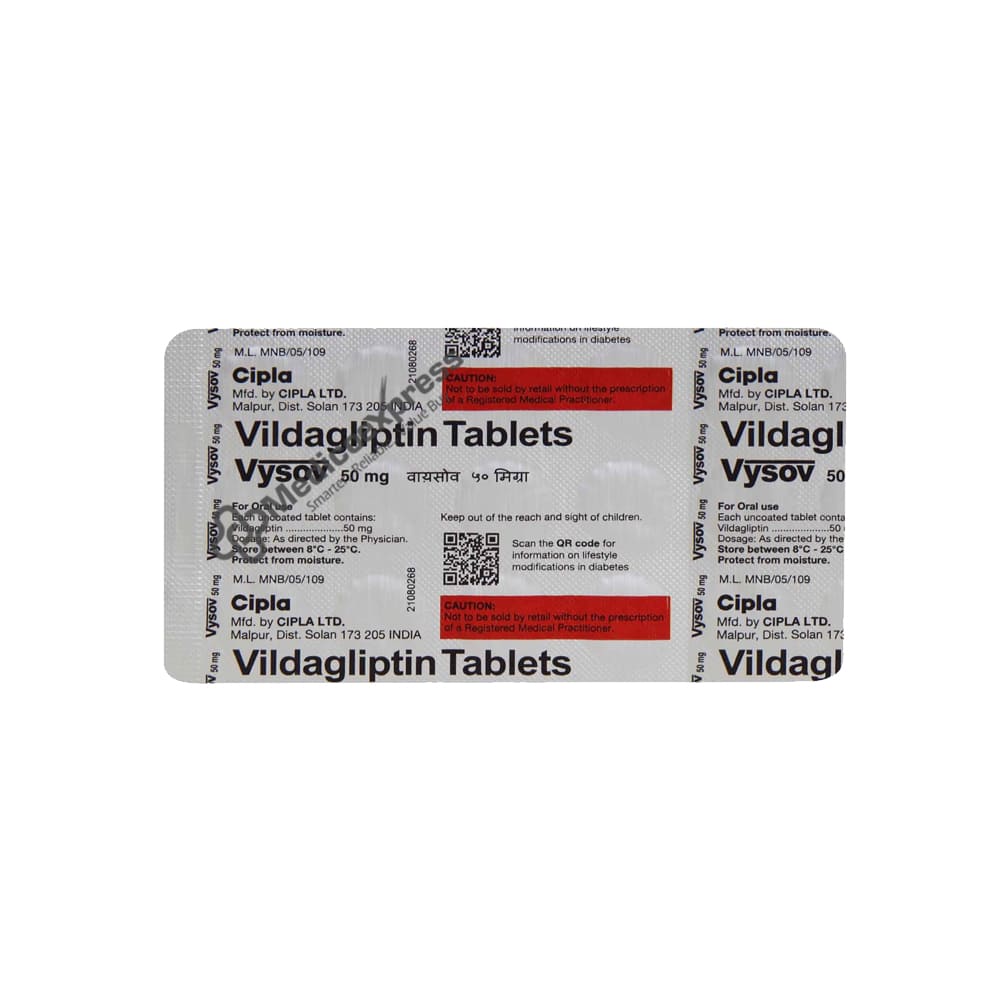 Vysov 50 mg Tablet 15 belongs to a class of anti-diabetic drugs known as 'dipeptidyl peptidase 4 (DPP-4) inhibitors, which are used to treat type 2 diabetes, particularly in patients whose blood sugar levels are not controlled by diet and exercise alone.Disclaimer:For More Information Contact Your Physician