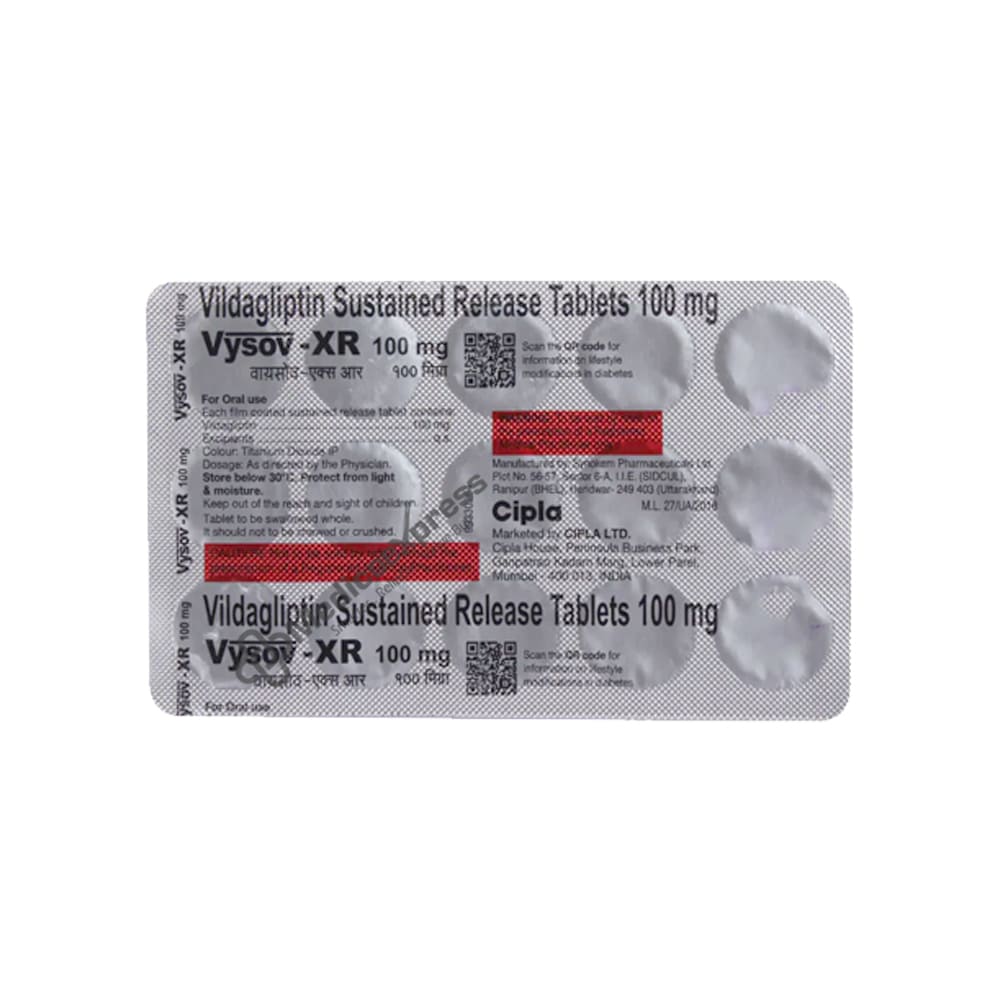 Vysov XR 100 mg Tablet 15 belongs to a class of anti-diabetic drugs known as 'dipeptidyl peptidase 4 (DPP-4) inhibitors, which are used to treat type 2 diabetes, particularly in patients whose blood sugar levels are not controlled by diet and exercise alone.Disclaimer:For More Information Contact Your Physician