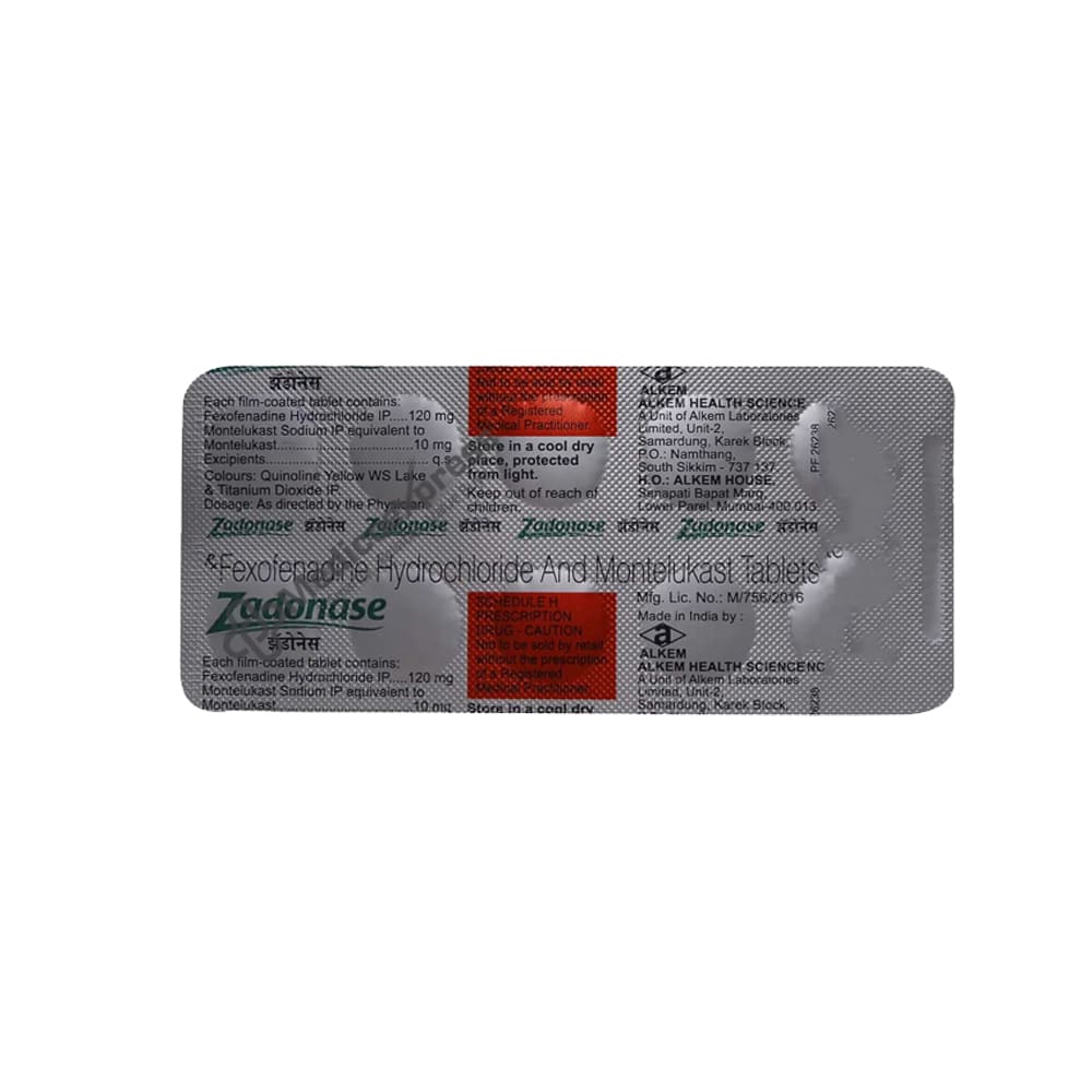 Zadonase Tablets 10's are primarily used to treat allergic symptoms like sneezing, runny nose, congestion, stuffy nose, or watery eyes. When the immune system reacts to a foreign chemical that is generally not damaging to your body, an allergy is a disorder that develops. 'Allergens' are these alien chemicals. Certain foods and seasonal allergens like hay fever, pollen, or pet dander may cause allergies in some people. When mucus or a foreign irritant enters the respiratory system, one of the main signs of allergies is a cough, which occurs as a reflex in the throat.Disclaimer:For more information contact your physician.