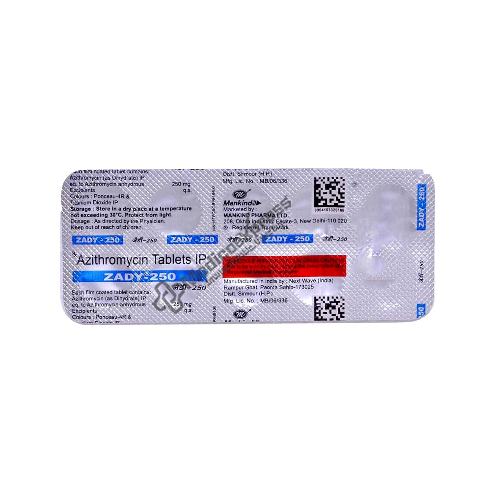 Zady 250 mg tablet 6's belongs to the macrolide antibiotic class of medications. It is used to treat bacterial infections of the respiratory system (such as pneumonia, bronchitis, tonsillitis, pharyngitis, and sinusitis), skin infections (such as acne and rosacea), ear infections, and sexually transmitted diseases.Disclaimer:For more information contact your physician